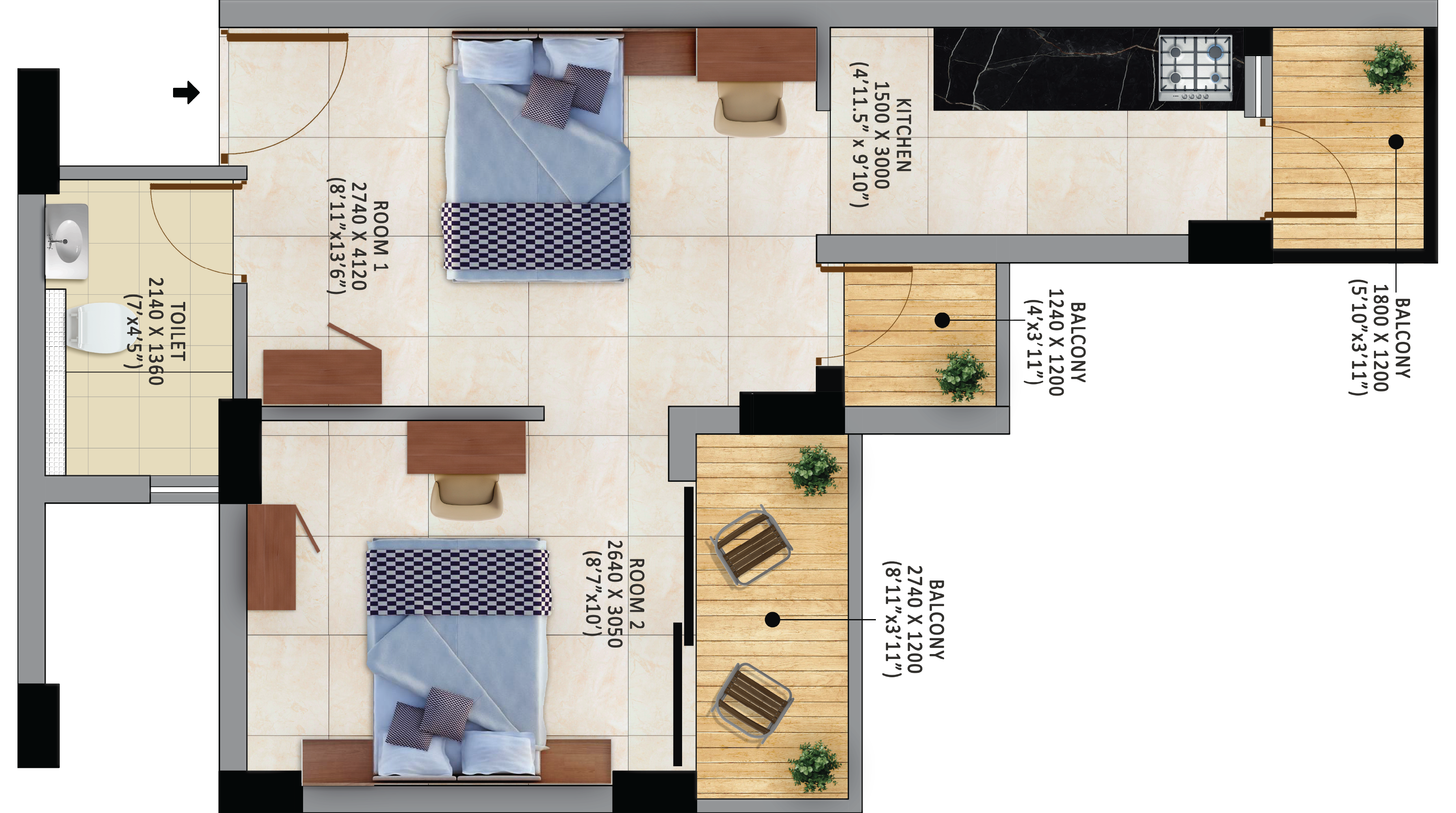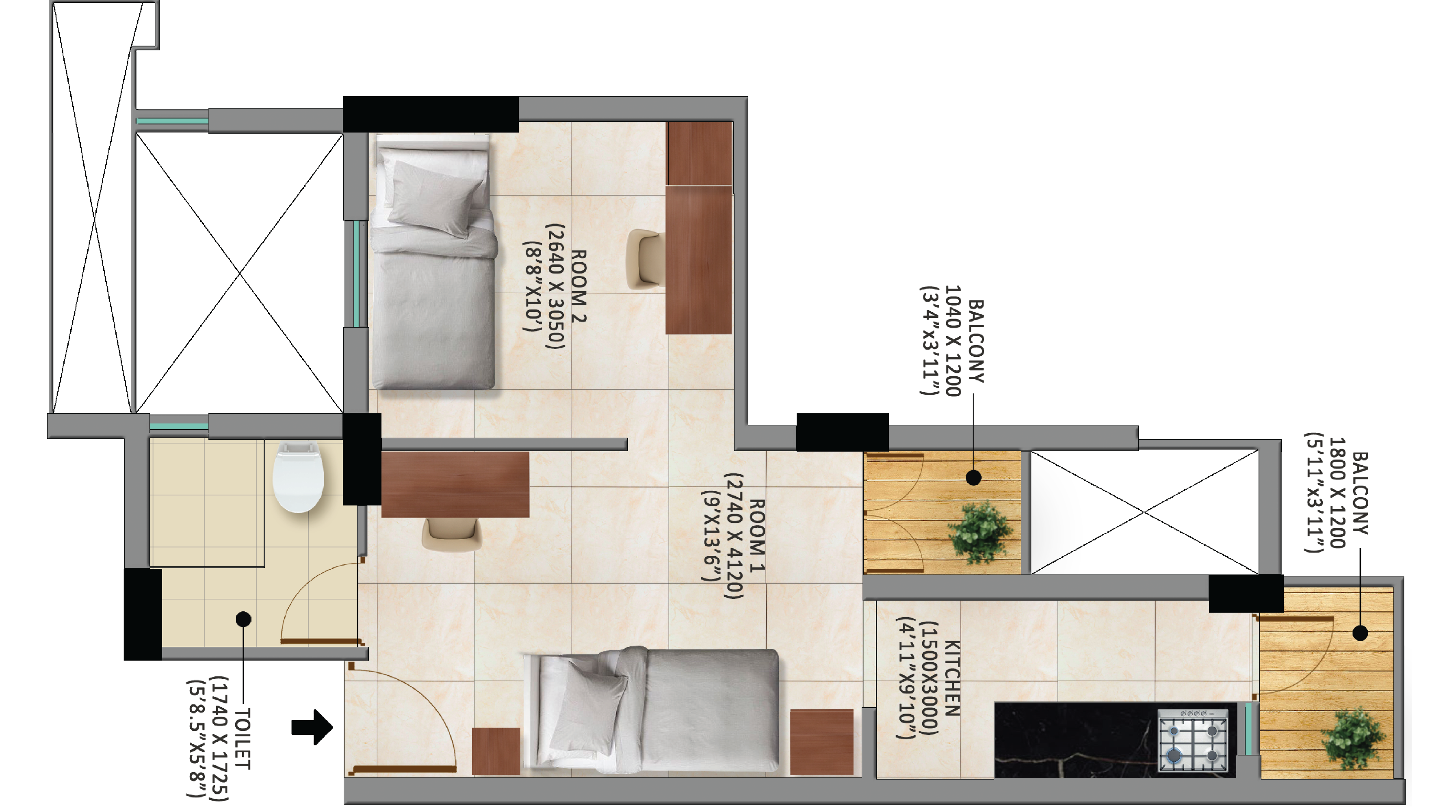 2 BHK + 1 Bath